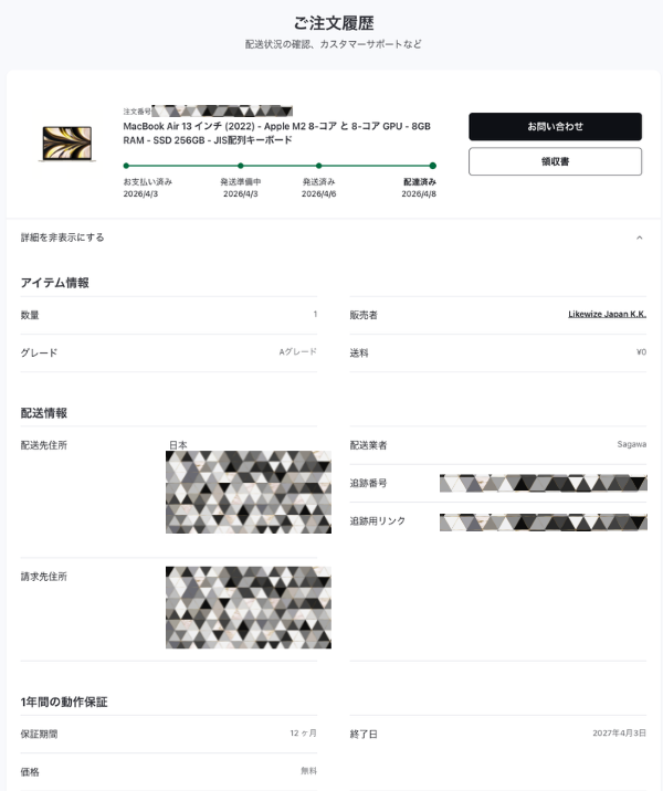 | 保証 | 1年間(Apple公式) | 3ヶ月〜(店舗保証) | 12ヶ月(標準装備) |